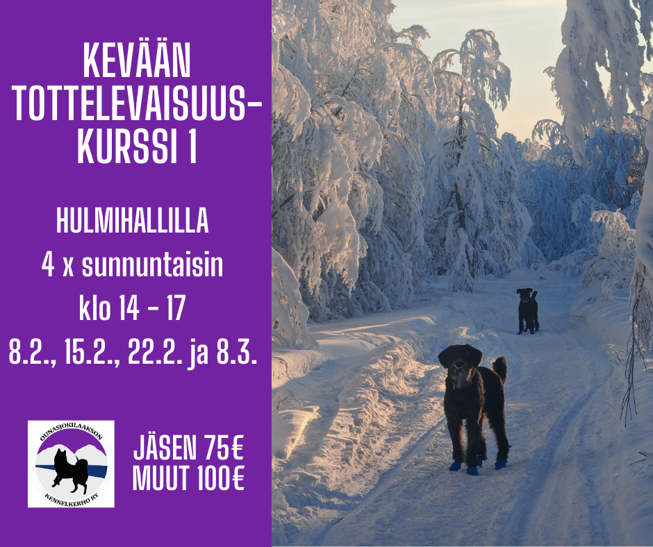 Neljän kerran tottelevaisuuskurssi kaikenikäisille ja -tasoisille koirille; kilpailuihin tähtääville tai arjen hallintaan apua kaipaaville. Harjoitukset suunnitellaan koirakon mukaan yhteiset teemat ensin sopien, tottelevaisuusliikkeitä kuten sivulle tuleminen, luoksetulo, istuminen ja maahanmeno ja seuraaminen mukaillen. Kurssin minimiosallistujamäärä on 4 ja maksimi 6.